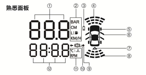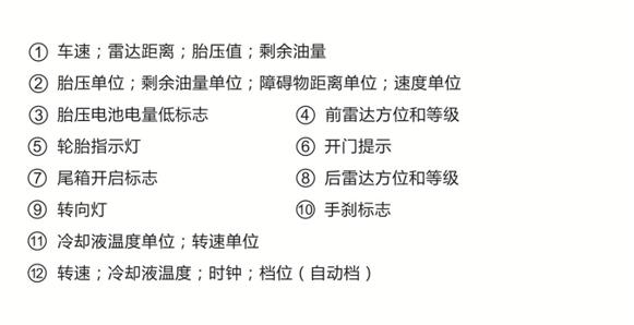 1)具体显示的信息。1.车速,2.时间,3.转速,4.水温,5.档位,6.车门状态,7.转向灯提示,8.手刹提示,9.后尾箱提示。注意,其中时间,转速,水温,档位这个四个显示模式同一时间只能显示其中的一个。